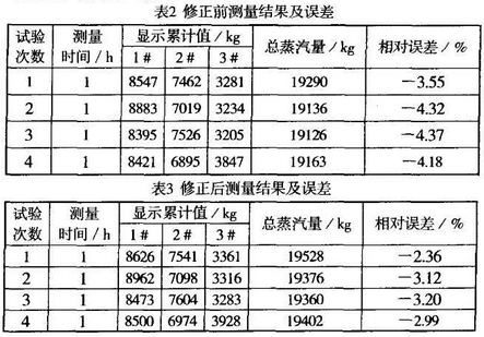 兩臺20t/h鍋爐交替運行,1#和2#管道為φ325mm,3#管道為φ273mm,壓力為0.3~0.4MPa,溫度250℃。流量計出廠時儀表常數為Kep=258.00次/m³,修正后的儀表常數為Kt=255次/m3。其修正前、后的測量結果及誤差見表2和表3。