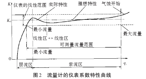 儀表常數(shù)特性曲線如圖2所示。從圖2可以看出,儀表常數(shù)的線性范圍與標定系數(shù)K。的關系直接影響著流量計的精度。