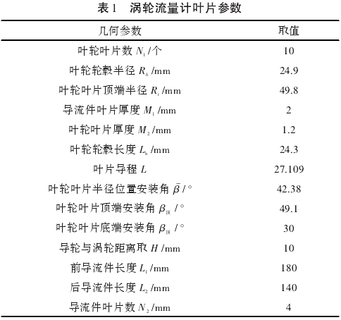 渦輪流量計口徑大小不同,葉片數(shù)量也應不同。小口徑的流量計(D≤100mm),葉輪葉片數(shù)量通常為3~8片;大口徑的流量計(D>100mm;),葉輪葉片數(shù)則通常為10片以上5。根據(jù)流量計設計準則得出的參數(shù)如表1所示。